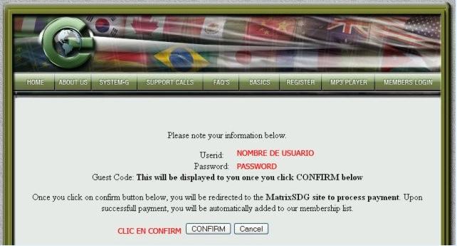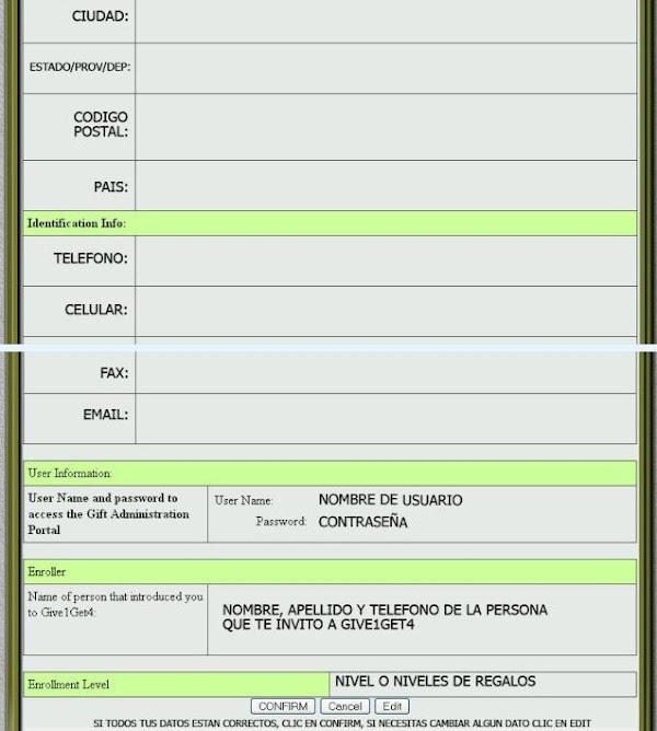 En este paso te recuerdan tu nombre de usuario y contraseña para acceder a tu oficina virtual de Give1Get4, escribe estos datos en una hoja para que no se te olviden y haz clic abajo donde dice CONFIRM.