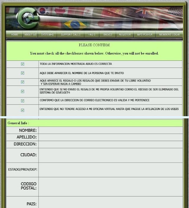 Donde dice ZIP/Postal hay debes escribir tu código postal, si no lo sabes entonces escribe 00000. Donde dice Teléfono escribe tu teléfono con el código del país y ciudad. lo mismo donde dice: celular Donde dice Fax puedes dejar en blanco esa casilla. Donde dice UserID vas a crear un nombre de usuario para poder acceder a tu oficina virtual de G1G4, puedes crear cualquier nombre de usuario, si esta repetido puedes probar con otro. Donde dice Password vas a crear una contraseña cualquiera para acceder a tu oficina virtual de G1G4. Donde dice Confirm Password debes escribir otra vez la contraseña. En la parte de abajo donde aparecen las casillas de 100, 250, 500 y All, debes seleccionar el cuadro del regalo o de los regalos en los que vas a iniciar, si vas a iniciar en los regalos de $100 dólares entonces seleccionas el cuadrito que está a la izquierda de 100. Si vas a iniciar en los regalos de 100 y 250 dólares entonces seleccionas los cuadritos de 100 y 250, y si vas a iniciar en los tres regalos, entonces seleccionas los tres cuadritos de 100, 250 y 500.