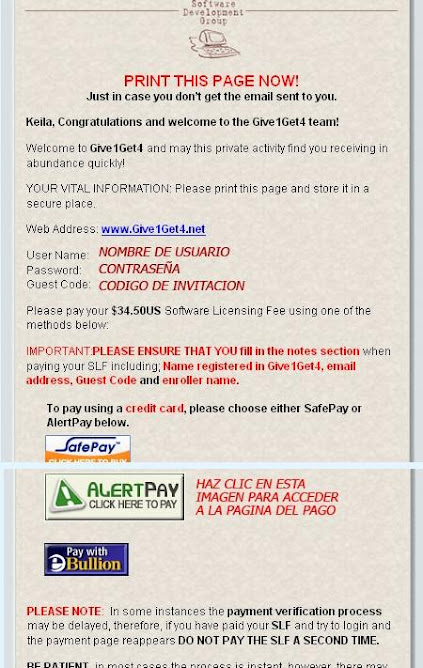 En este paso te vuelven a recordar tu nombre de usuario y contraseña para acceder a tu oficina virtual de Give1Get4, anotalos. Tu guest code, codigo de invitacion, te lo daran luego que hagas tu pago de $35 el cual debes usar para afiliar a otras personas contigo!. Ahora haz clic en la imagen que dice AlertPay Clic here To Pay.